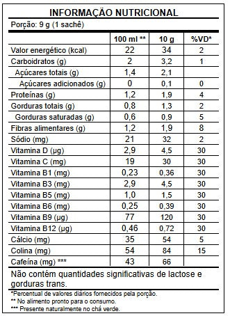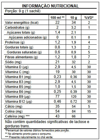 Ingredientes: leite em pó integral zero lactose, chá verde (extraído das folhas da planta Camellia sinensis (L.) Kuntze), polidextrose, bitartarato de colina, ácido ascórbico, colecalciferol, niacinamida, d-pantotenato de cálcio, cloridrato de tiamina, cloridrato de piridoxina, ácido fólico, cianocobalamina, aromatizante idêntico ao natural, antiumectante dióxido de silício, regulador de acidez bicarbonato de sódio e edulcorante sucralose.